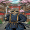 한손에 칼들고 시가를 물고 선글라스를 끼고 있는 일본풍 골목길 배경에 고양이 실사화 캐릭터